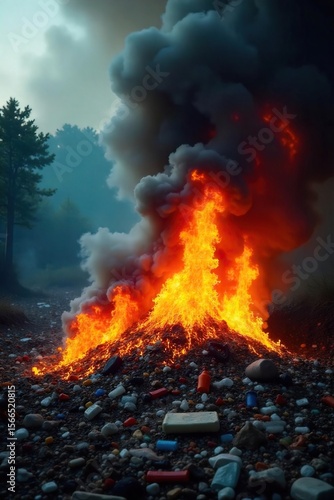 Fiery inferno engulfing discarded plastic waste, creating toxic smoke and intense heat Environmental disaster, pollution, recycling crisis , garbage, crisis