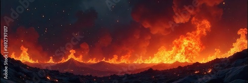 Fiery inferno raging against a dark night sky, embers floating, intense heat and dramatic flames Perfect for illustrating danger, destruction, or apocalypse themes , fire, nature, yellow