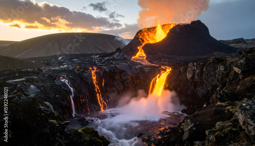 volcano, lava, eruption, sunset, fire, mountain, landscape, nature, iceland, volcanic, magma, rock, geology, dramatic, fiery, hot, orange, red, black, dark, light, glow, night, day, extreme, power, energy, flow, waterfall, stream