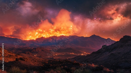 fire, wildfire, mountain, night, sky, star, galaxy, smoke, flames, landscape, nature, dramatic, dark, red, orange, light, cloud, desert, hill, scene, view, scenery, panorama, glow, burning, blaze, inferno, cosmic, astronomic, celestial, nocturnal, hot, heat, devastation, destruction, environment, disaster, emergency, danger, warning, pollution, impact, climate, change, global, warming, effect, risk, threat