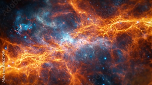 Fiery nebula with blue and orange cosmic clouds, stars, and gas.
