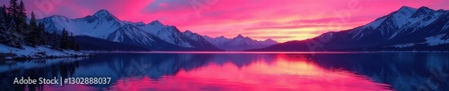 Fiery pink alpenglow bathes Lake Tahoe's mountains and glassy surface , stillness, water