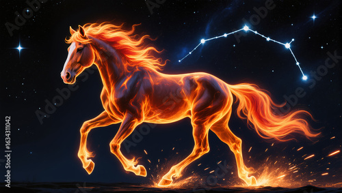 Fiery red horse running under starry night sky with glowing constellation, symbol of 2026 year of Fire Horse