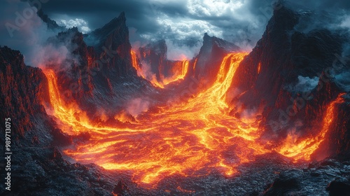 lava, volcano, magma, eruption, fire, mountain, rock, heat, flow, stream, landscape, nature, geology, volcanic, hot, danger, red, orange, yellow, black, dark, cloud, sky, dramatic, powerful, intense, wild, inferno, desolate, deserted, fiery, molten, glowing, flowing, burning, melted, steam, smoke, contrast, light, aerial, digital, art