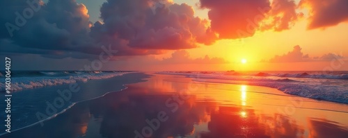 Fiery sunrise paints ocean gold; mirror-like reflection , dramatic, light rays, landscape