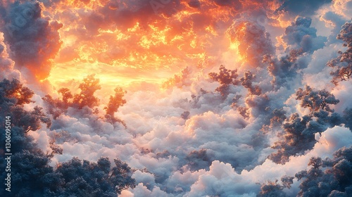 Fiery sunset cloudscape glows warmly above a sea of fluffy white and gray clouds. AI Generated