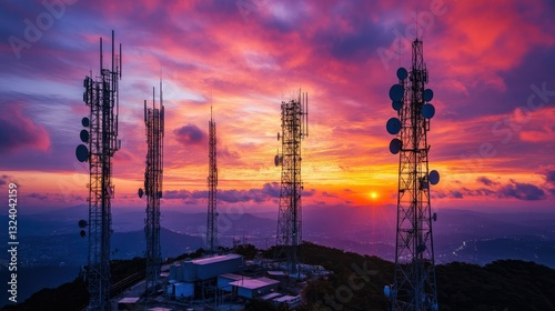 Fiery sunset light glows behind massive telecom towers, emphasizing the striking contrast between technology and natural beauty