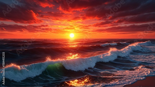 sunset, ocean, wave, sea, beach, sky, cloud, dramatic, fiery, crimson, red, orange, gold, light, horizon, water, art, painting, seascape, landscape, nature, photo, image, picture, artwork, canvas, print, poster, digital, commercial, sale, buy, download, vibrant, intense, romantic, serene, peaceful, beautiful, aesthetic, artistic, colours