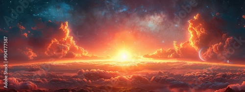 Fiery sunset over a forest, with dramatic clouds illuminating the sky in vibrant shades of orange, red, and yellow, creating a beautiful summer evening landscape