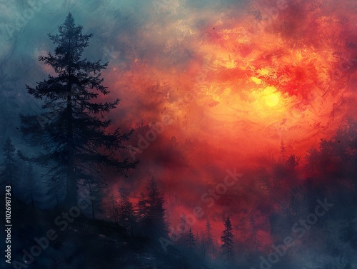 mysterious, spiritual, painting, orange, art, yellow, sky, digital artwork, abstract, intense, balance, silhouette, peaceful, fire, beautiful, inspiring, pattern, landscape, blue, eerie, shadow, dramatic, depth, composition, perspective, powerful, tree, red, dark, fantasy, nature, dream, vibrant, light, harmony, magical, sunset, texture, forest, colourful, mist, surreal, contrast, serene, fog, atmospheric