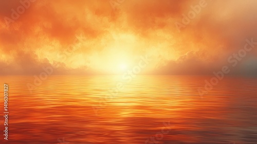 sunset, fiery, orange, water, cloud, sky, gold, vibrant, warm, sun, horizon, still, calm, peaceful, dramatic, fierce, blaze, heat, light, colours, red, yellow, warmth, fire, fog, mist, atmosphere, sunlight, glow, intense, beauty, nature, ocean, sea, view, landscape, painting, digital, art, impression, high-coloured, wide, panorama