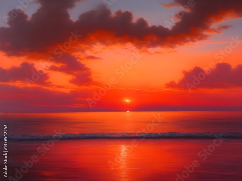 sunset, ocean, wave, sea, sky, cloud, colours, red, orange, vibrant, tranquil, peaceful, serene, calm, beauty, breathtaking, mesmerizing, light, shadow, artistic, painting, artwork, art, nature, landscape, horizon, fiery, mood, atmosphere, still, water, beach, coastal, evening, dusk, sun, glow, radiant, picturesque, dramatic, majestic, sublime, intense, soft, fluffy, gentle, wonder