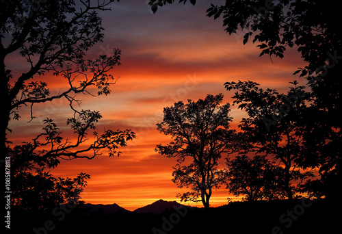 sunset, silhouette, tree, vibrant, evening, nature, fiery, sky, colours, landscape, outdoors, horizon, twilight, peaceful, scenery, dramatic, artistic, gold, dusk, warm, shadow, cloud, breathtaking, view, tree, sun, sunrise, orange, red, cloud, yellow, colours