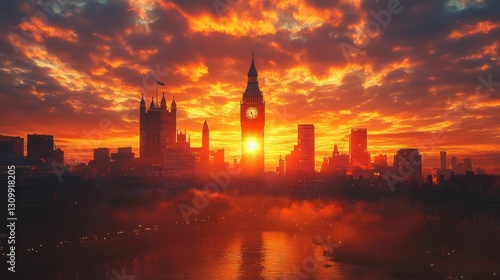 sunset, city landscape, silhouette, building, orange, red, fiery, sky, cloud, river, fog, mist, urban, city, architecture, evening, dusk, light, glow, warm, hazy, dramatic, majestic, golden hour, horizon, water, london