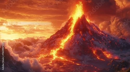 volcano, eruption, lava, fire, mountain, sunset, snow, cloud, fiery, hot, magma, peak, landscape, nature, dramatic, sky, red, orange, geology, power, energy, destruction, creation, catastrophy, disaster, danger, hazard, awesome, beautiful, amazing, incredible, spectacular, vibrant, intense, bright, light, darkness, heat, smoke, ash, rock, earth, scene, view, image, photo, picturesque, majestic