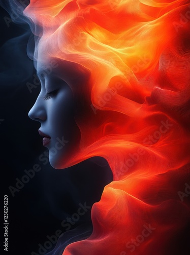 woman, fire, smoke, profile, face, fantasy, art, portrait, head, hair, abstract, design, beauty, flames, girl, mystical, mysterious, digital, energy, passion, power, spirit, soul, emotion, feeling, creative, imagination, illustration, graphic, visual, artwork, concept, red, orange, dark, light, model, female, elegant, stylish, intense, surreal