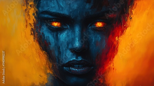 woman, face, portrait, art, painting, digital, artwork, fire, orange, blue, eye, glowing, intense, dark, mysterious, dramatic, textured, abstract, expression, emotion, fierce, powerful, burning, infernal, fantasy, surreal, enigmatic, smudged, stroke