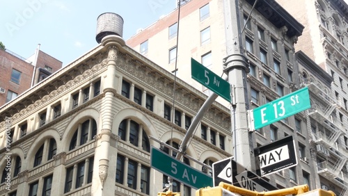 Fifth avenue 5 ave road sign, Manhattan midtown architecture, New York City 5th av street corner. Traffic crossroad signage, USA. Real estate in America, residential property. Rooftop water tower tank