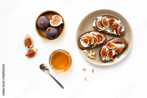 Figs and cheese toasts on the plate with jar of honey, top view