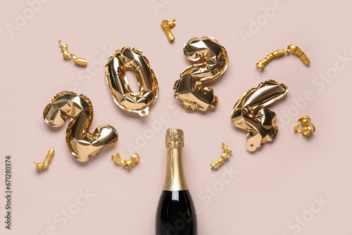 Figure 2024 made of balloons, ribbons and champagne bottle on beige background