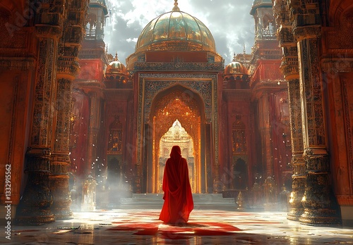 eid, figure, temple, grand, ornate, illuminated, soft light, mystical, spiritual, atmospheric, enchanting, ramadan, celebration, holy, sacred, beautiful, serene, peaceful, stunning, elegant, traditional, cultural, breathtaking, mesmerizing, radiant, celestial, moody, refined, scenic, twilight, divine