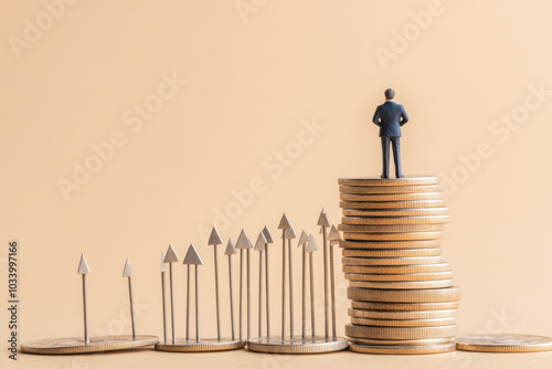 Figurine stands on coins, arrows point upwards, symbolizing financial growth.