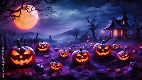 ハロウィン、紫のカボチャと風景