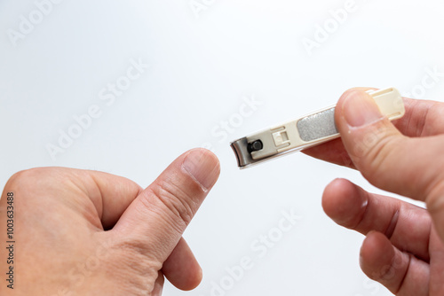 nail clippers, hand, finger, cut off, nail, thumb, fingertip, people, equipment, man, white background, cosmetic, health, copy space, skin, lifestyle