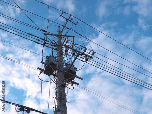 landscape, telephone pole, wire, powerline, electricity, sky, blue skies, sunny, cable, copy space, japan, cloud, brownout, live, energy, saving, choice, expenditure, consumer, home, corporation, town, power