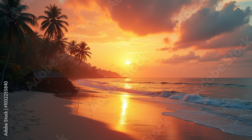 sunset, beach, palm, sea, tropical, ocean, forest, sky, sun, sunrise, nature, silhouette, island, water, evening, landscape, summer, travel, hawaii, paradise, coast, tonight, orange, vacation