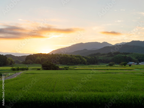 morning sun, sunrise, rice field, rice field, field, farming, nara, morning, morning, sunny, unmanned, japan, rural, fall, landscape, sky, cloud, mountain, open air, idyl, rice, paddy, view