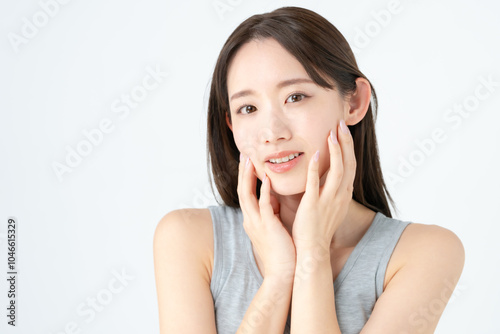 skincare, woman, skin, young, cosmetic, beauty, white, white background, cheek, face, dryness, ultraviolet, smile, winter, pretty, clean, people, girl, japanese, asian, bare skin, satisfaction, peace, make-up, make-up, adult, 30s, fall, tan, morning sun, acne, hand, health