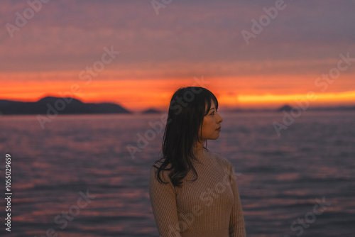 sunset, sea, woman, sky, silhouette, golden hour, travel, sun, sunlight, sunset, landscape, lifestyle, vacation, nature, person, sunrise, alone, red, japanese, beach, beauty, outdoors, hair, model, fashion, face, brunette, look, lady, relax, relaxation, couple