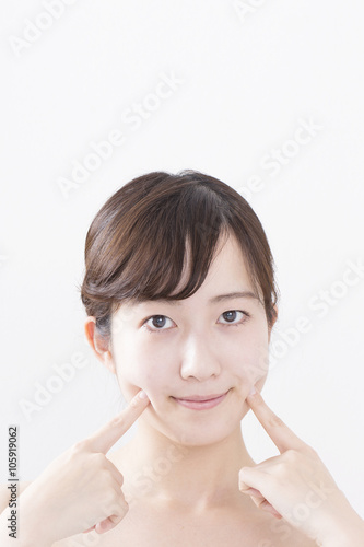 dimple, expression, trouble, people, woman, woman, japanese, girl, young, 30s, make-up, face, make-up, beauty, beauty, cosmetic, sweet, beauty, cosmetic, make-up, white, date, light, lifestyle, indoor, copy space, mouth, finger, smile, naked, skin, este, health, skincare