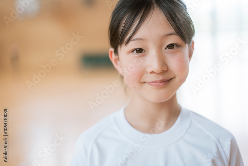 school, gym, smile, sweet, junior high, woman, student, japanese, portrait, training, girl, youth, black hair, young, children, puberty, people, indoor, indoor, asian, woman, ponytail, children