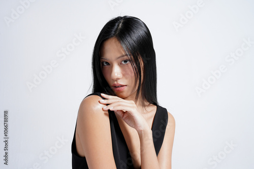 white background, people, woman, portrait, young, asian, korean, southeast asia, light, cosmetic, beauty, care, beauty, make-up, make-up, make-up, cosmetic, skincare, skin, este, hair, coiffure, black hair, hair care, fashion, dress, model, face, expression, clean, beauty, sweet, cool, solemn, tone, lady