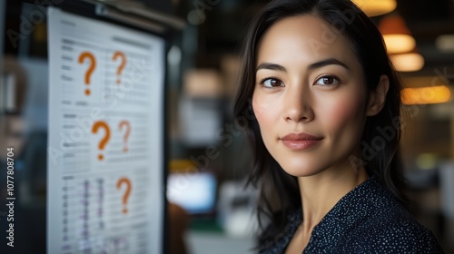 問題解決と意思決定のためにオフィス環境で疑問符を分析する思慮深い女性