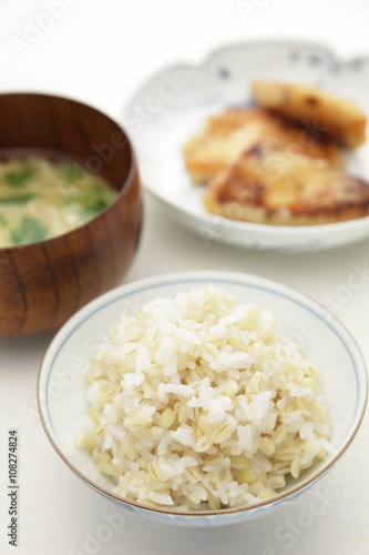 barley, barley, wheat, grain, rice, white rice, rice, miso soup, fish, foodstuff, food, table, health, healthful, diet, closeup, up, dish, teacup, dish