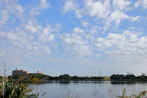landscape, blue skies, sky, nature, sunny, cloud, japan, open air, water surface, water, blue, white, lake, fall, green, wood, light, reflex, bridge