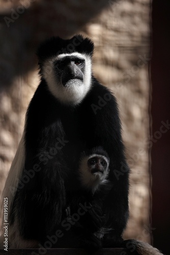 子供を抱いて見上げるアビシニアコロブス