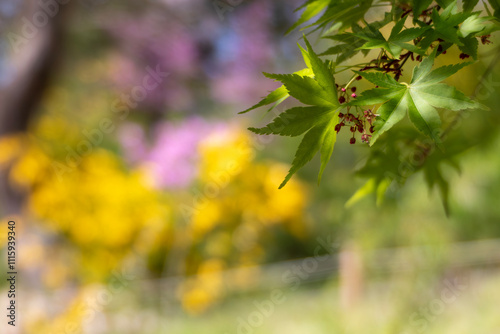 カラフルな新緑の緑が美しい公園の風景 滋賀県大津市びわこ文化公園