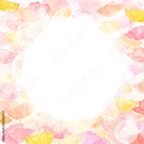 カラフルなポピーの花々で丸く囲んだフレーム。春らしい色合いの水彩イラスト。