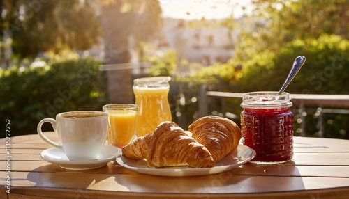 나무 테이블 위에 가지런히 놓인 브런치 크루아상, 딸기 잼, 신선한 주스, 그리고 커피 한 잔