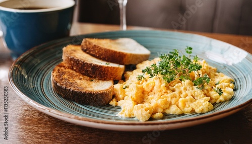 스크램블 에그와 토스트가 담긴 접시, 그리고 신선한 허브 장식