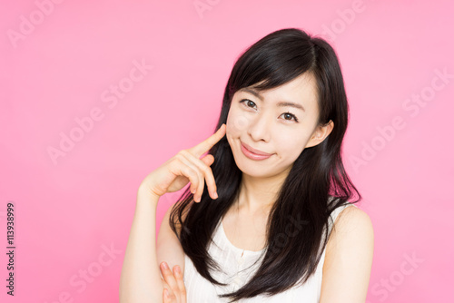 woman, contemplate, thinking, problem, hope, trouble, young, sweet, beauty, smile, appealing, black hair, japanese, pretty, white, model, people, portrait, asian, pink, background, copy space