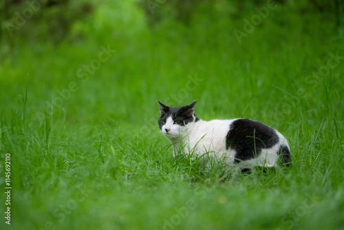 cat, black-and-white, tussock, animal, grass, black, sweet, felino, white, mammal, nature, fur, small, garden, lovely, look