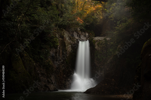 fall, waterfall, fall, flow, stream, canyon, lovely, beauty, clean, nature, dynamic, tour tourism, emotion, image, material, background, landscape, mountain, japan, tourist attraction, river, yellow, showplace, view, spray, green, rock, forest