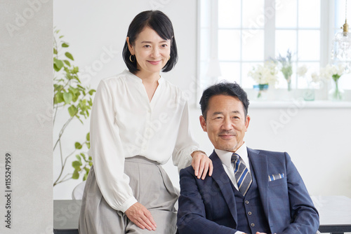 businessman, smile, portrait, office, couple, colleague, synchronization, president, boss, secondary, staff, man, woman, business, two people, suit, employee, cool, work, middle-aged, 50's, corporation, seated, indoor, compatible, chum, salaried employee, fellow, indoor, office, japanese, asian, people