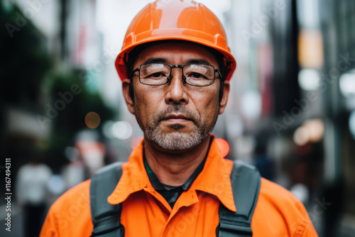 都市で働くオレンジ色のヘルメットを被った男性の真剣な表情