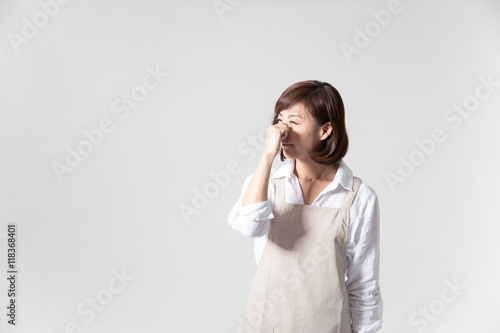 woman, alone, people, japanese, middle-aged, face, casual, portrait, refreshing, light, asian, white background, white, cut-out, copy space, indoor, indoor, waist up, adult, woman, shirt, mother, mother, mother, homemaker, part, sideline, customer service, apron, housekeeper, care, housekeeping, clerk, staff, rhinitis, sniffle, hay fever, cold, snot, stinky